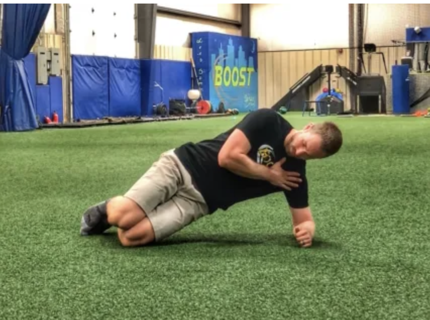 Lie on your side with your forearm on the floor, elbow directly beneath your shoulder.